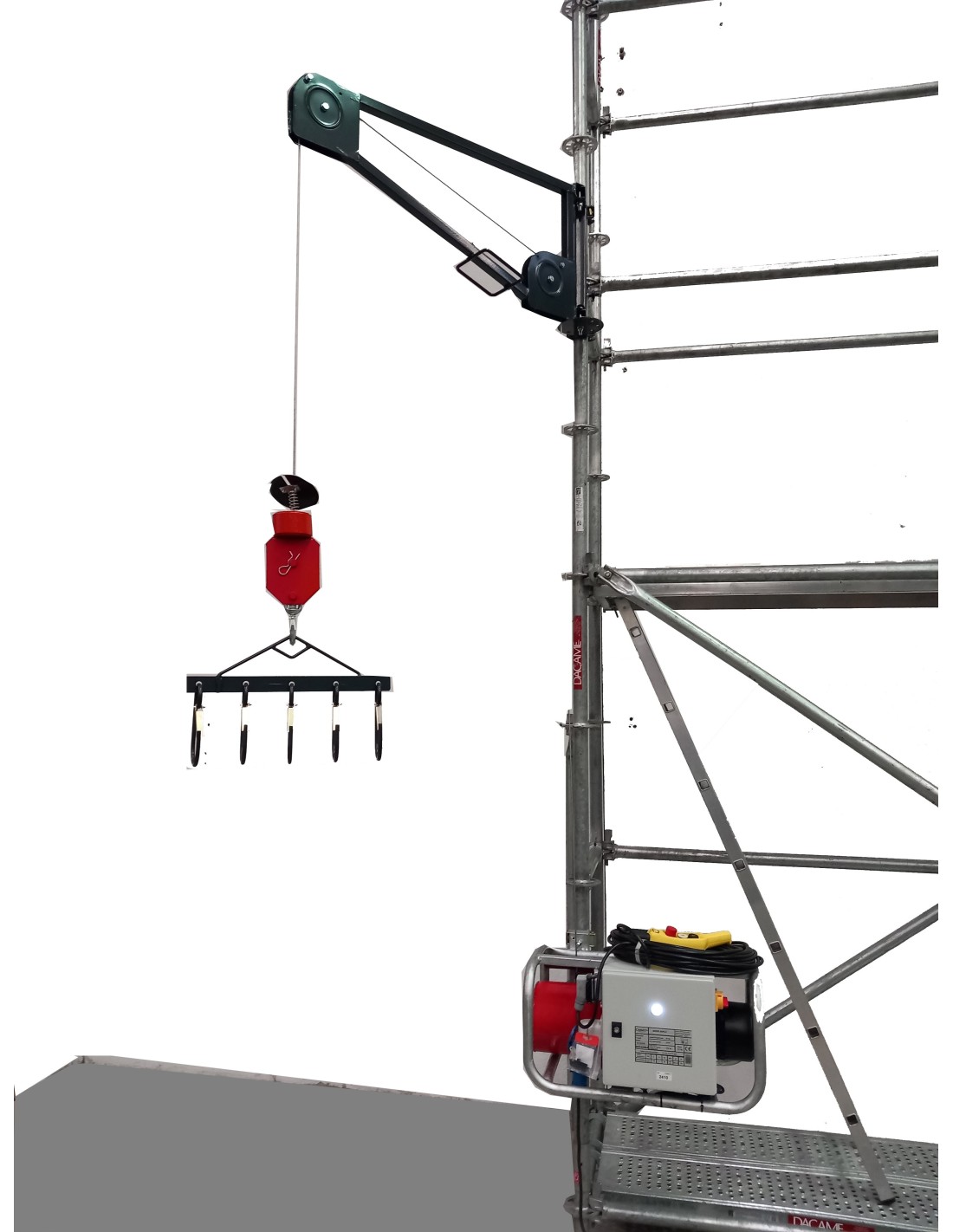 Fácil extracción de poleas para facilitar la colocación del cable de altura. Especialmente diseñado para facilitar y agilizar el montaje del andamio tubular. Dispone de 2 velocidades y un gancho especial para elevar elementos de andamio. Final de carrera integrado en el motor para evitar los enganches de la mercancía.