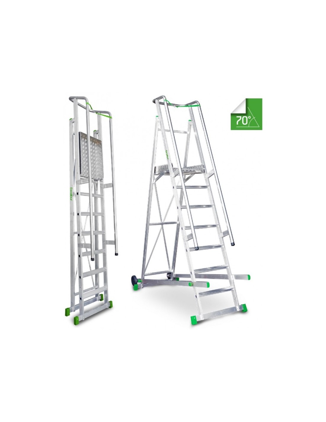 Escalera plegable de almacén con ruedas fabricada en aluminio y una superficie de trabajo antideslizante de 52x62 cm, con peldaños antideslizantes de 8 cm de profundidad y pasamanos en ambos lados. La carga máxima es de 150 kg.