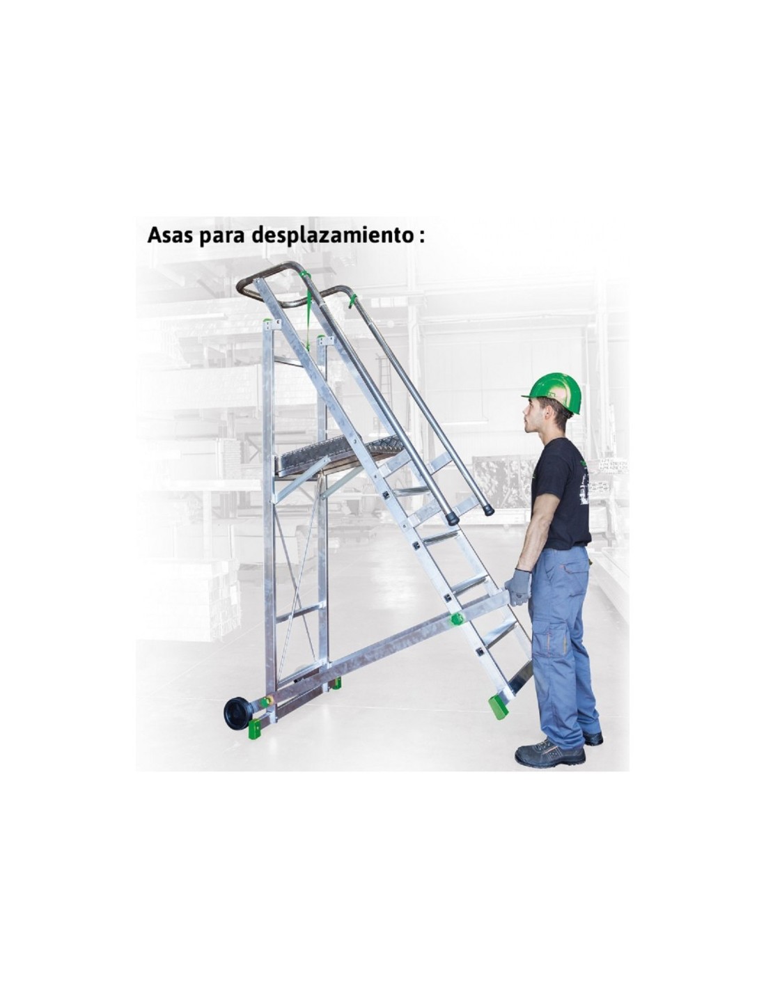La escalera se desplaza mediante dos asas que permiten levantar la escalera para que las dos ruedas apoyen al suelo.