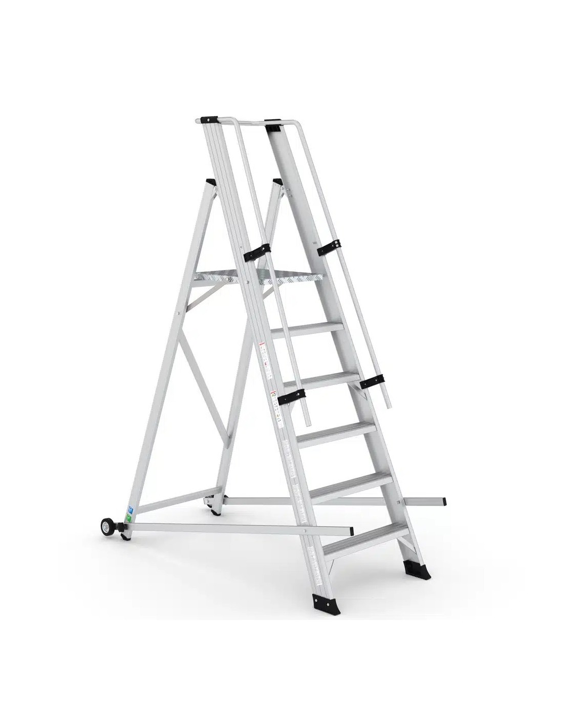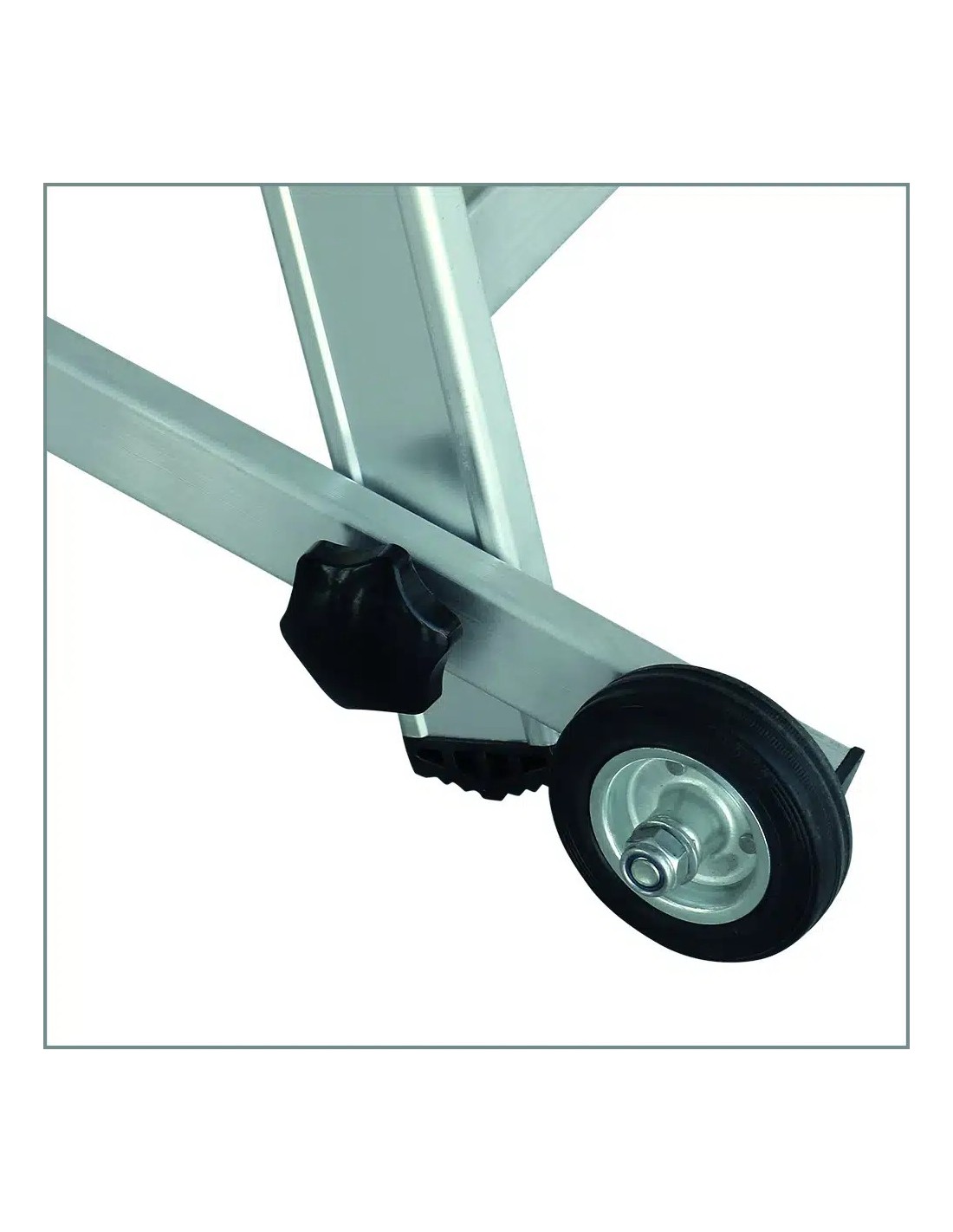 Equipada con ruedas de goma blanda, se transporta con facilidad, su sistema de plegado seguro facilita la manipulación y el almacenamiento de la escalera.