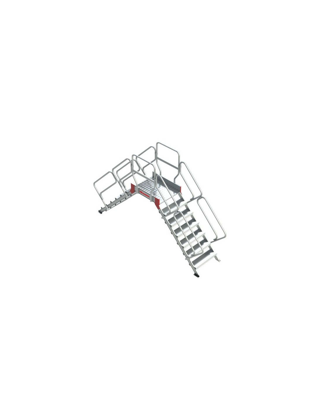 Fabricada con una combinación de aluminio ligero y resistente y componentes de acero, esta escalera puente está equipada con pasamanos a ambos lados, zócalos de 15 cm y barandillas desmontables de 110 cm de altura en tres lados, ofreciendo una protección completa durante el trabajo.