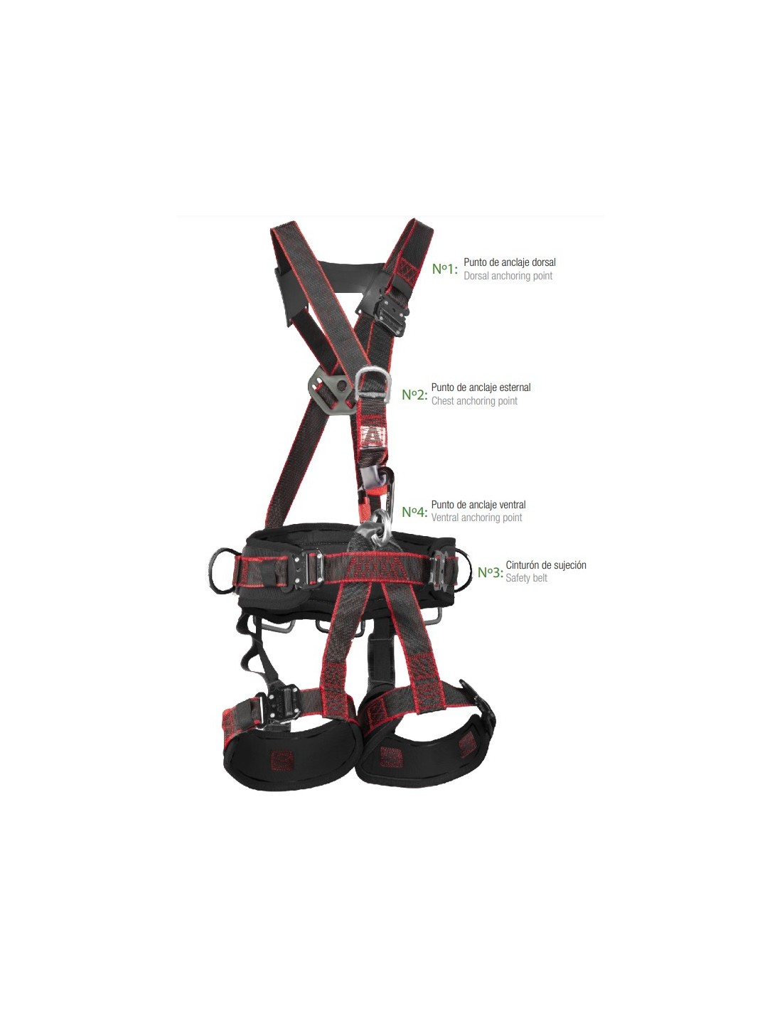 Contra quedas em altura (EN 361): possui dois pontos de ancoragem anti-queda (A), um dorsal (n.º 1), localizado no protetor de costas, e outro esternal (n.º 2), ambos em fivela D de aço 8 mm, para conectar um sistema anti-queda.