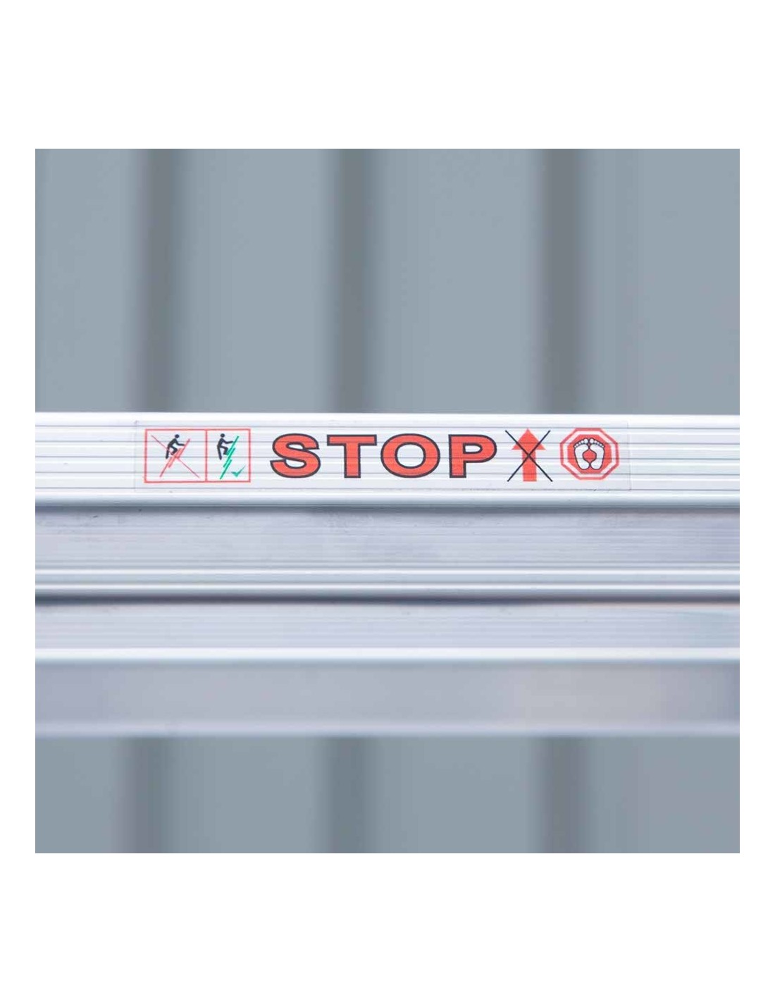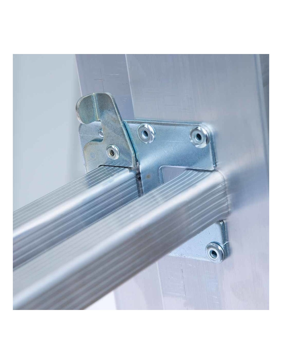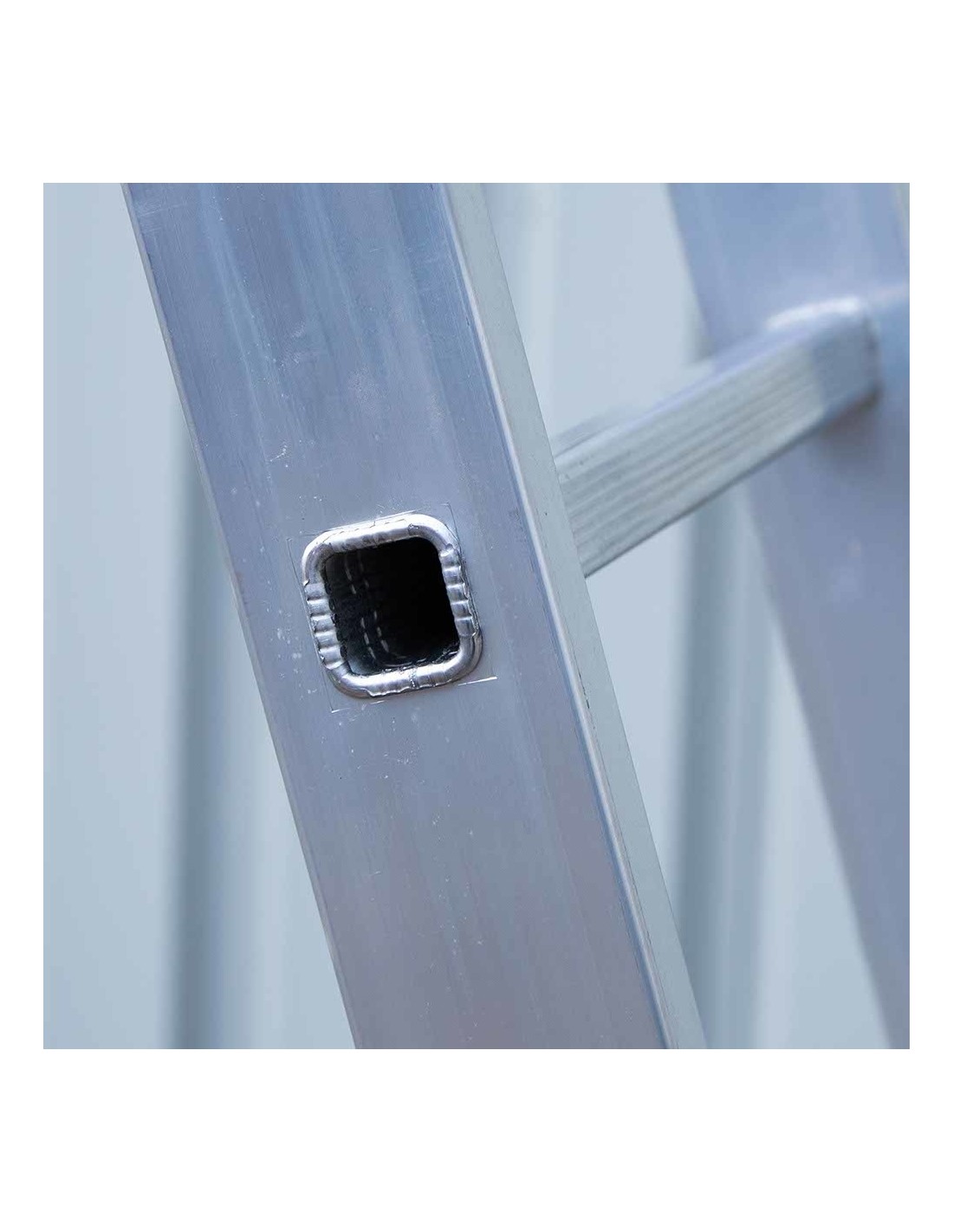 Estas escaleras están certificadas según la legislación europea EN131. Están hechas de aluminio de alta calidad y tienen varias partes de seguridad, como tapas antideslizantes para los pies y una viga de estabilidad. Esta escalera extensible no solo se puede usar apoyada contra un objeto estable, sino que también se puede usar sola. A esto lo llamamos la posición A. Una ventaja si no hay pared o pared disponible para colocar la escalera.