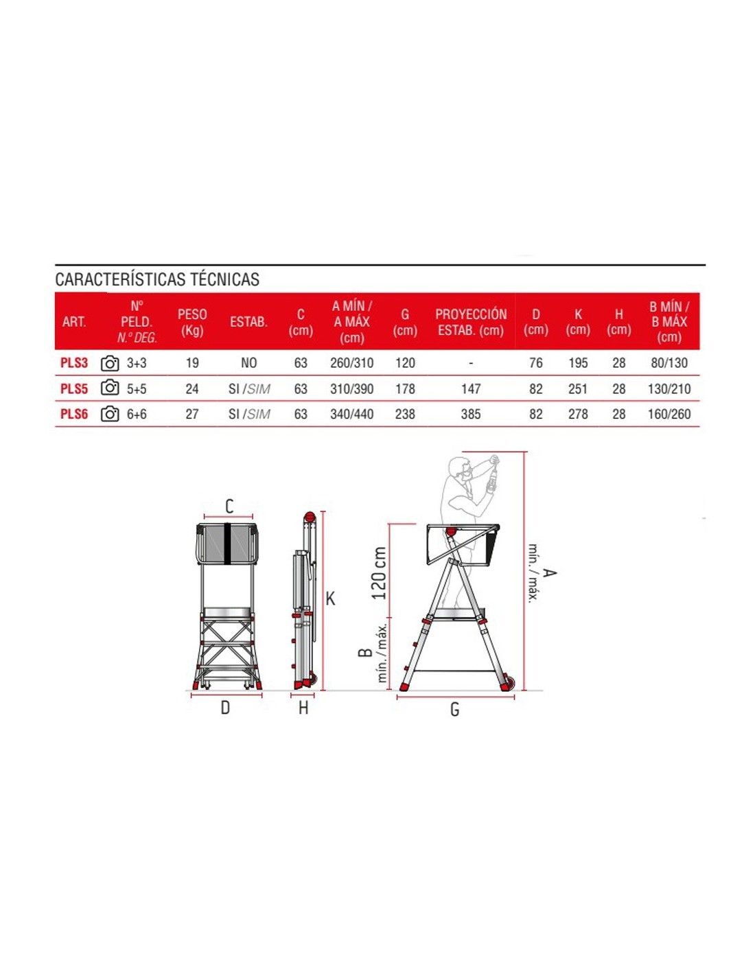 A PLS é uma escada dobrável, regulável em altura, com rodas duplas e uma grande superfície de trabalho antiderrapante.