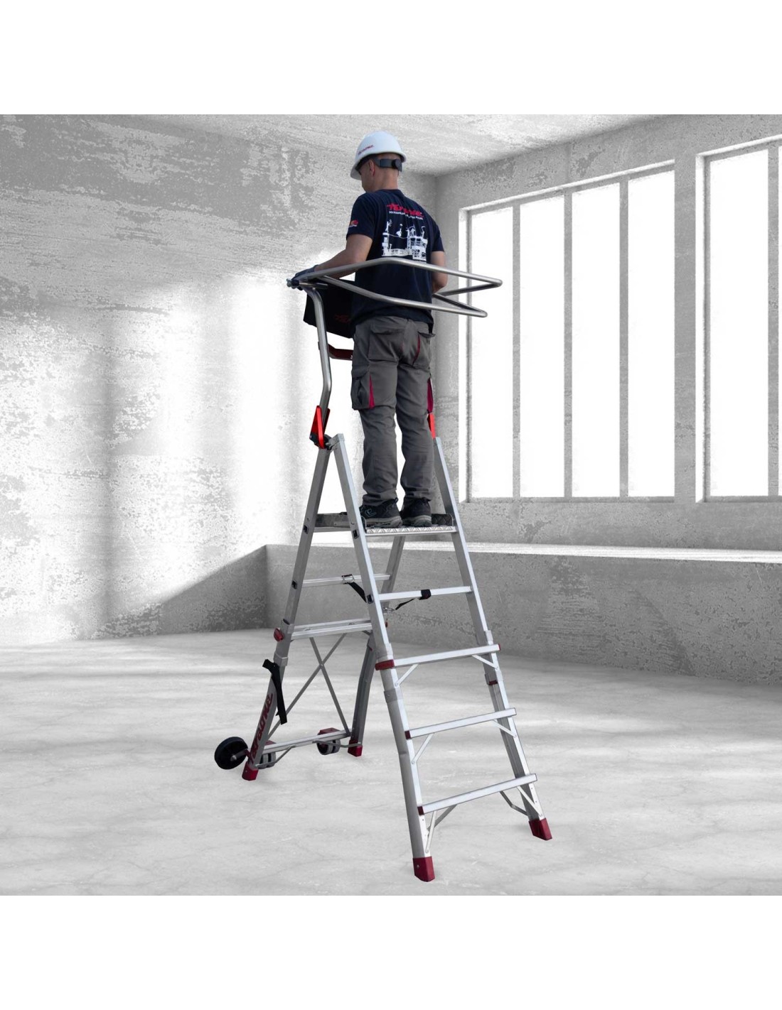O seu design inclui um inovador sistema de dobragem com fecho antiabertura, garantindo uma utilização segura e prática. Fabricada em alumínio, é resistente e leve, e possui rodas duplas que facilitam o transporte, mesmo em ambientes de trabalho exigentes.