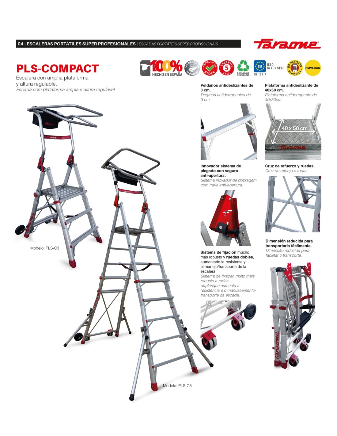 Além disso, a escada PLS-COMPACT foi concebida para uma utilização intensiva e vem com uma garantia de 5 anos, proporcionando confiança e durabilidade em cada operação. Consulte a ficha técnica na secção DOCUMENTAÇÃO.