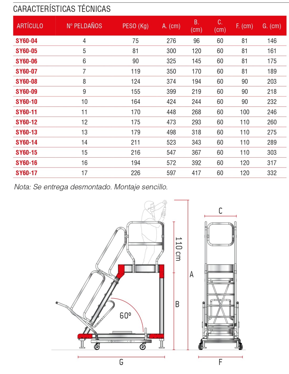 A SY60 é uma escada com rodas e uma grande superfície de trabalho antiderrapante de 60x100 cm com acesso através de uma escada inclinada de 60º com degraus antiderrapantes de 15 cm de profundidade e corrimãos em ambos os lados.