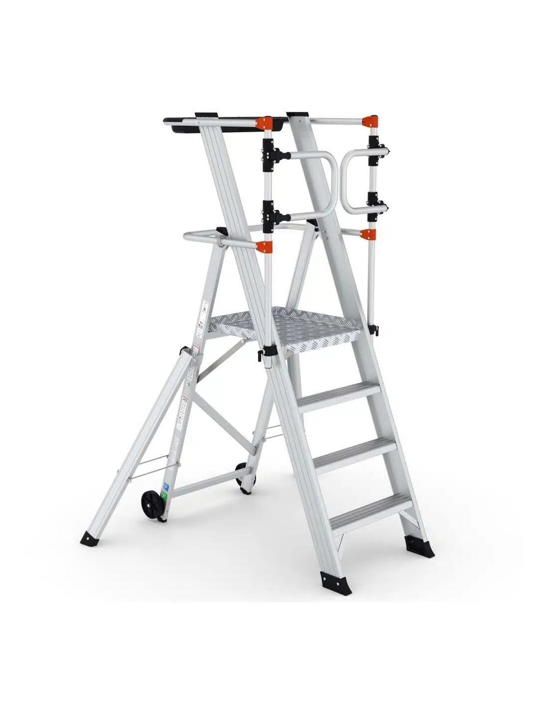 Escada de alumínio destinada ao trabalho profissional intensivo. Equipado com estabilizadores laterais e um prático porta-ferramentas.
