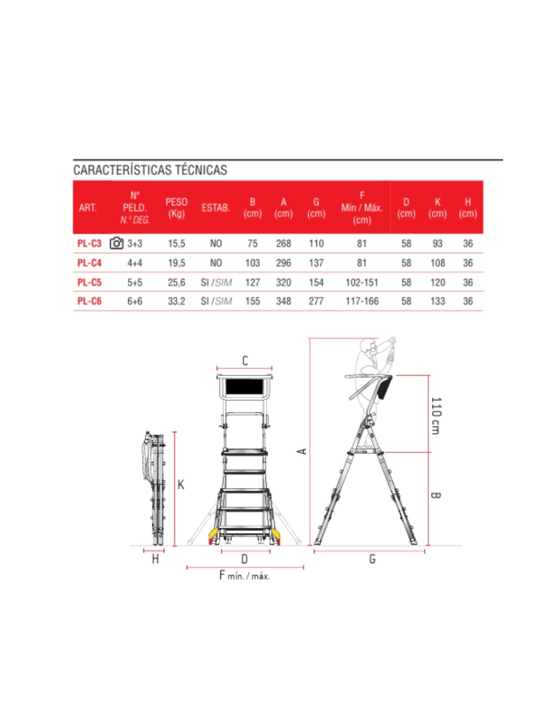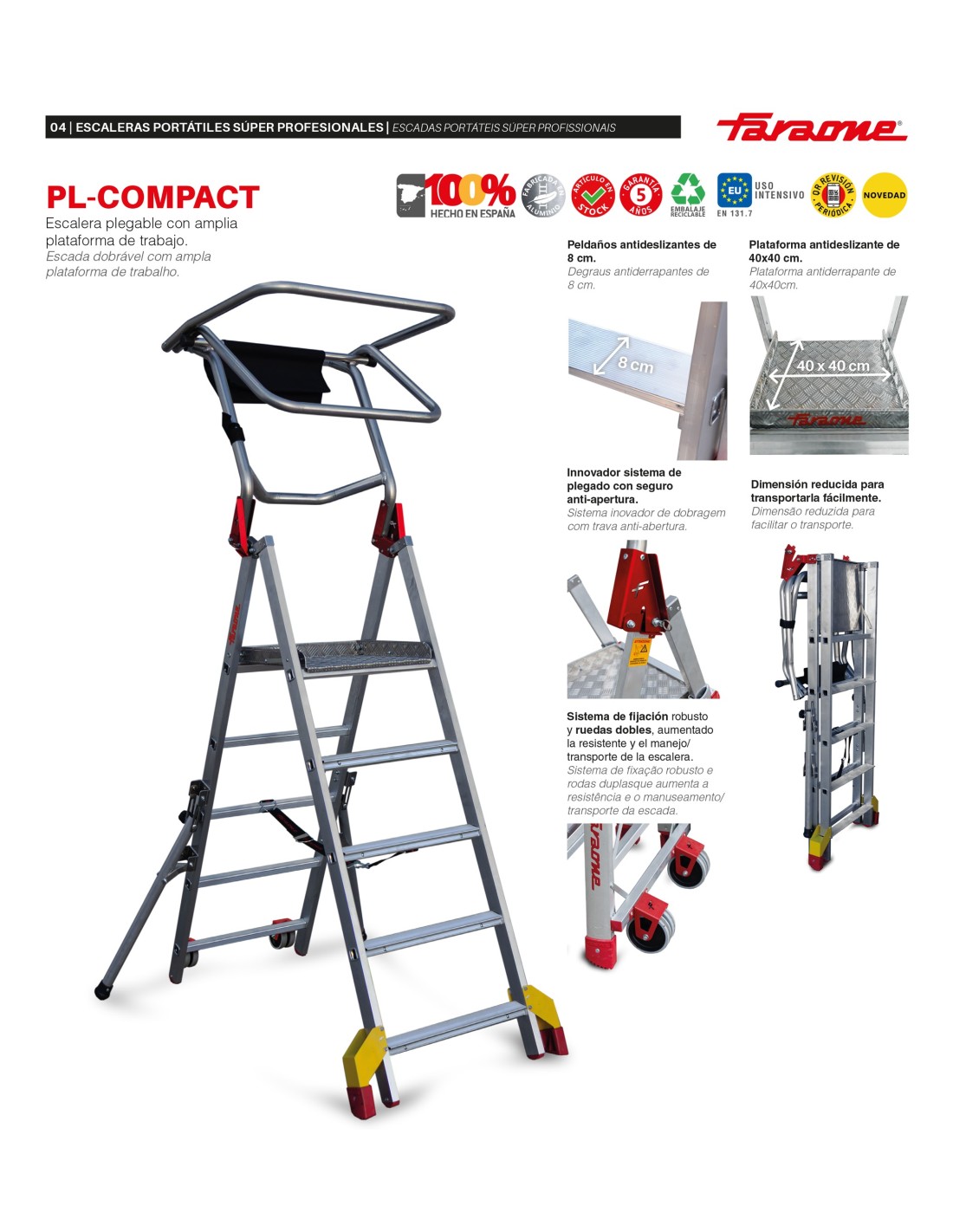 A escada dobrável PL-COMPACT foi concebida para proporcionar a máxima segurança, estabilidade e conforto em trabalhos em altura. Possui uma plataforma de trabalho antiderrapante de 40x40 cm e degraus de 8 cm, garantindo firmeza e conforto durante a utilização.