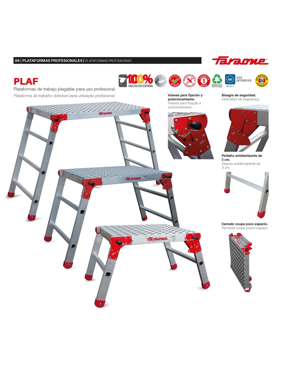 É uma plataforma de trabalho dobrável, com estrutura leve e robusta em alumínio.
