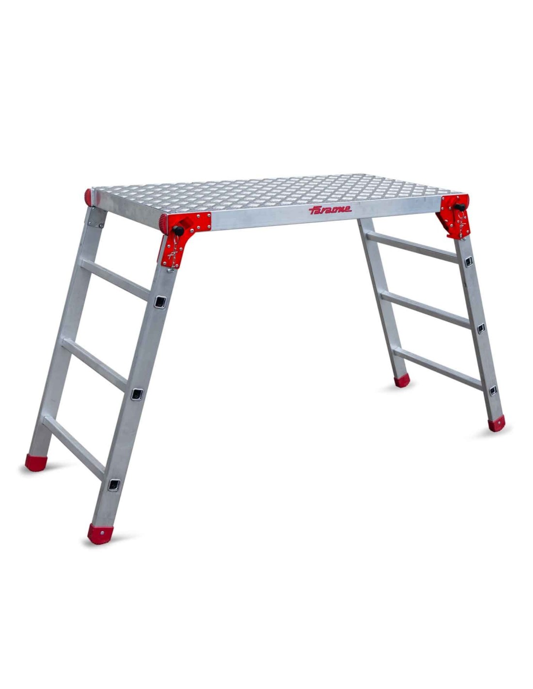 É uma plataforma de trabalho dobrável, com estrutura leve e robusta em alumínio.